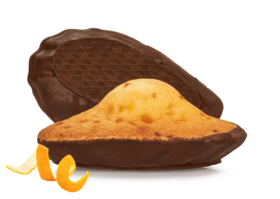 Vous l'attendiez, notre emblématique madeleine est maintenant disponible en version orange nappée d'un délicieux chocolat noir. Une madeleine moelleuse et délicatement parfumée qui vous rappellera de doux souvenirs d'enfance.