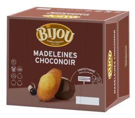farine de blé 27%, chocolat noir 18% (pâte de cacao, sucre, beurre de cacao, matière grasse laitière anhydre, émulsifiant : lécithines (soja), arôme naturel de vanille), huile de colza, sucre, œufs 14.5%, sirop de glucose-fructose, stabilisant : glycérol, poudres à lever : carbonates d’ammonium - carbonates de sodium - citrates de sodium (blé), sel, gluten de blé, lait écrémé en poudre, fibres végétales, arôme naturel.