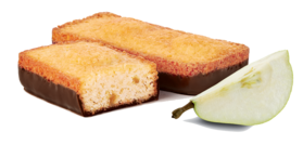 Pâtisseries fondantes aux pépites de poire semi confites (13,5%) nappées de chocolat noir