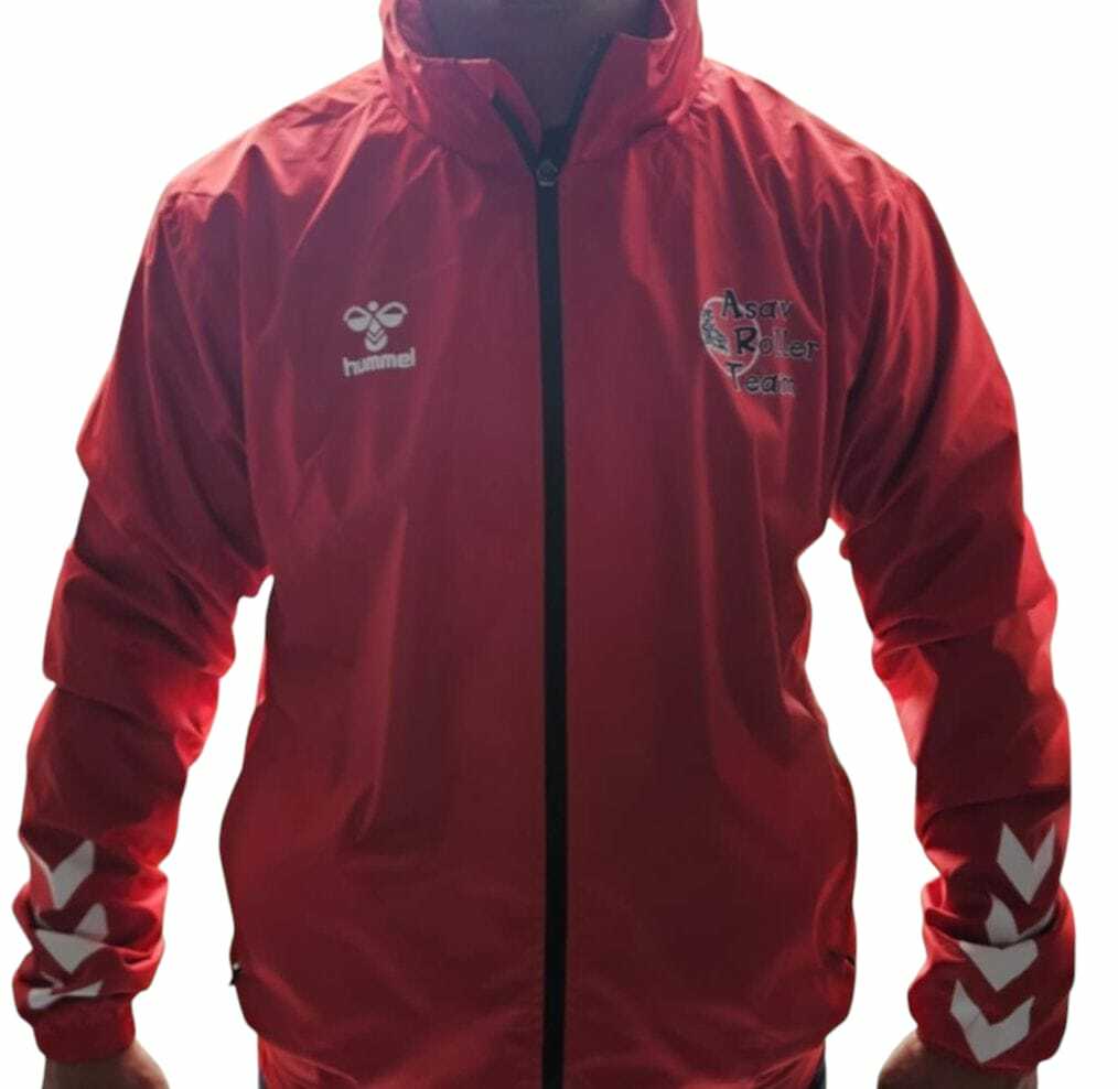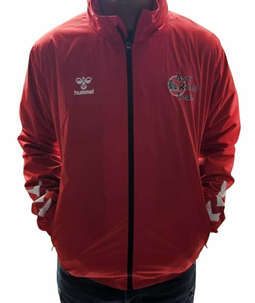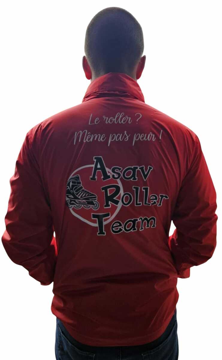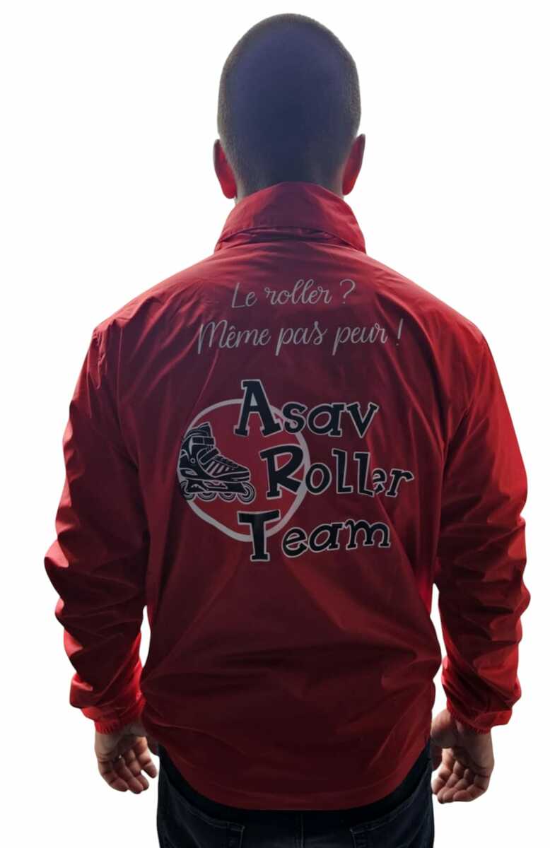 Coupe-vent de couleur rouge, avec le logo aux couleurs de l'ASAV ROLLER TEAM.